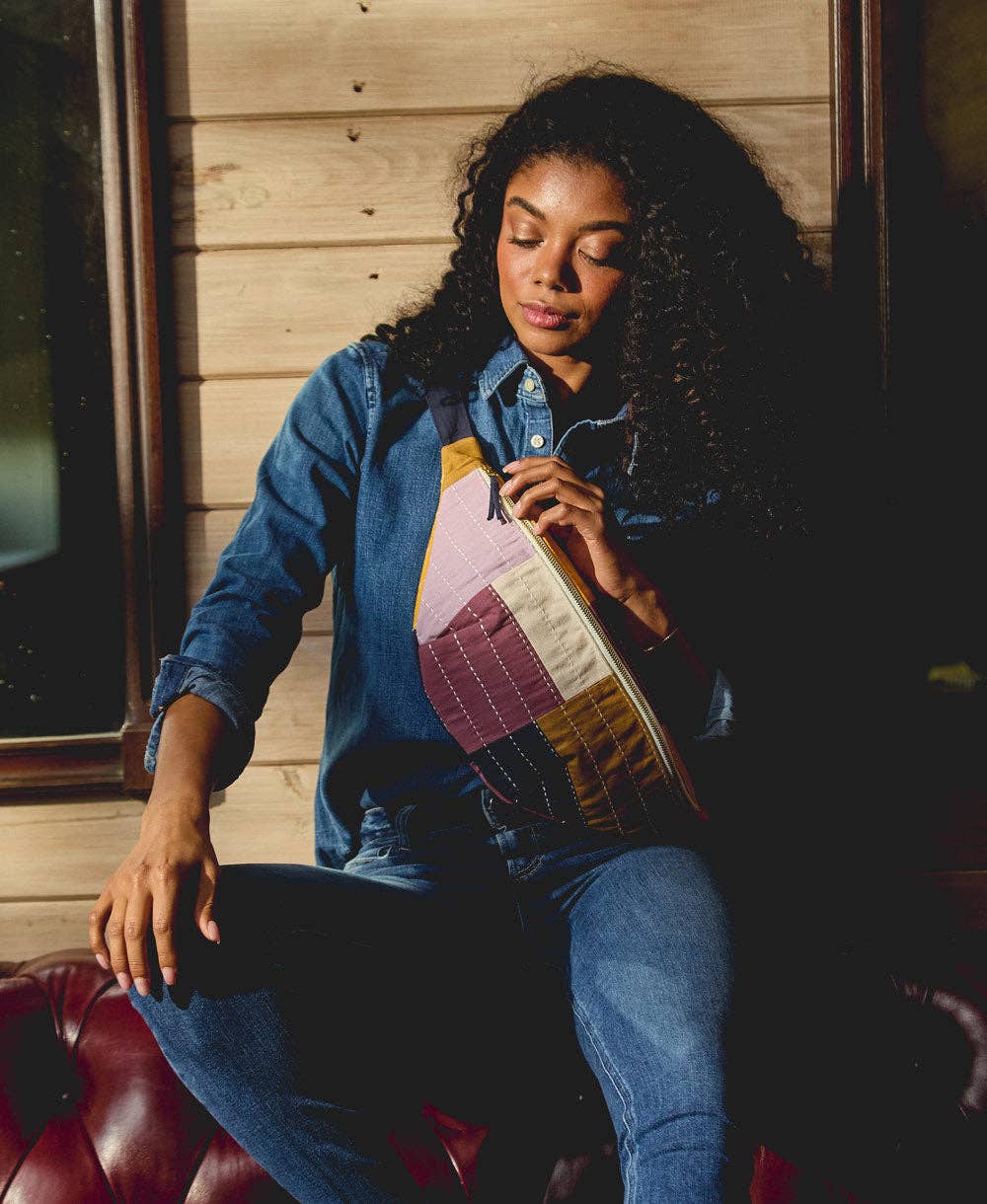 Featuring: 1 main zippered compartment, 1 interior slip pocket • Dyed with non-toxic & low-impact AZO-free dyes • Handcrafted by a skilled woman artisan in Ajmer, India • Features the hand-stitched signature of the maker on the tag